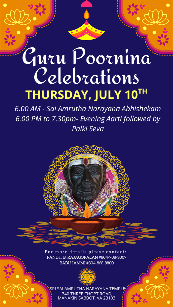 Guru Poornima Celebrations July 1, 2025 by sainarayana 0 Comments0 Comments Calendar Add to Calendar Add to Timely Calendar Add to Google Add to Outlook Add to Apple Calendar Add to other calendar Export to XML When: July 10, 2025 – July 11, 2025 all-day 2025-07-10T00:00:00-04:00 2025-07-12T00:00:00-04:00