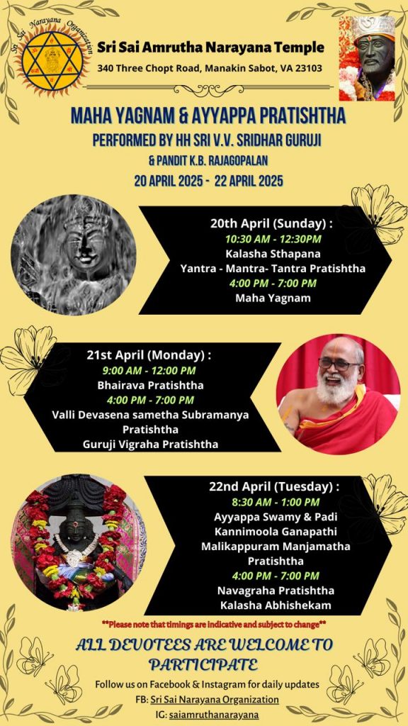 Maha Yagnam and Ayyappa Prathishta April 19, 2025 by sainarayana 0 Comments0 Comments Calendar Add to Calendar Add to Timely Calendar Add to Google Add to Outlook Add to Apple Calendar Add to other calendar Export to XML When: April 20, 2025 @ 12:00 am – April 22, 2025 @ 11:45 pm 2025-04-20T00:00:00-04:00 2025-04-22T23:45:00-04:00 https://www.youtube.com/live/ZdcdPw6yi3g?si=NjQr9_aB6l4qhHFR
